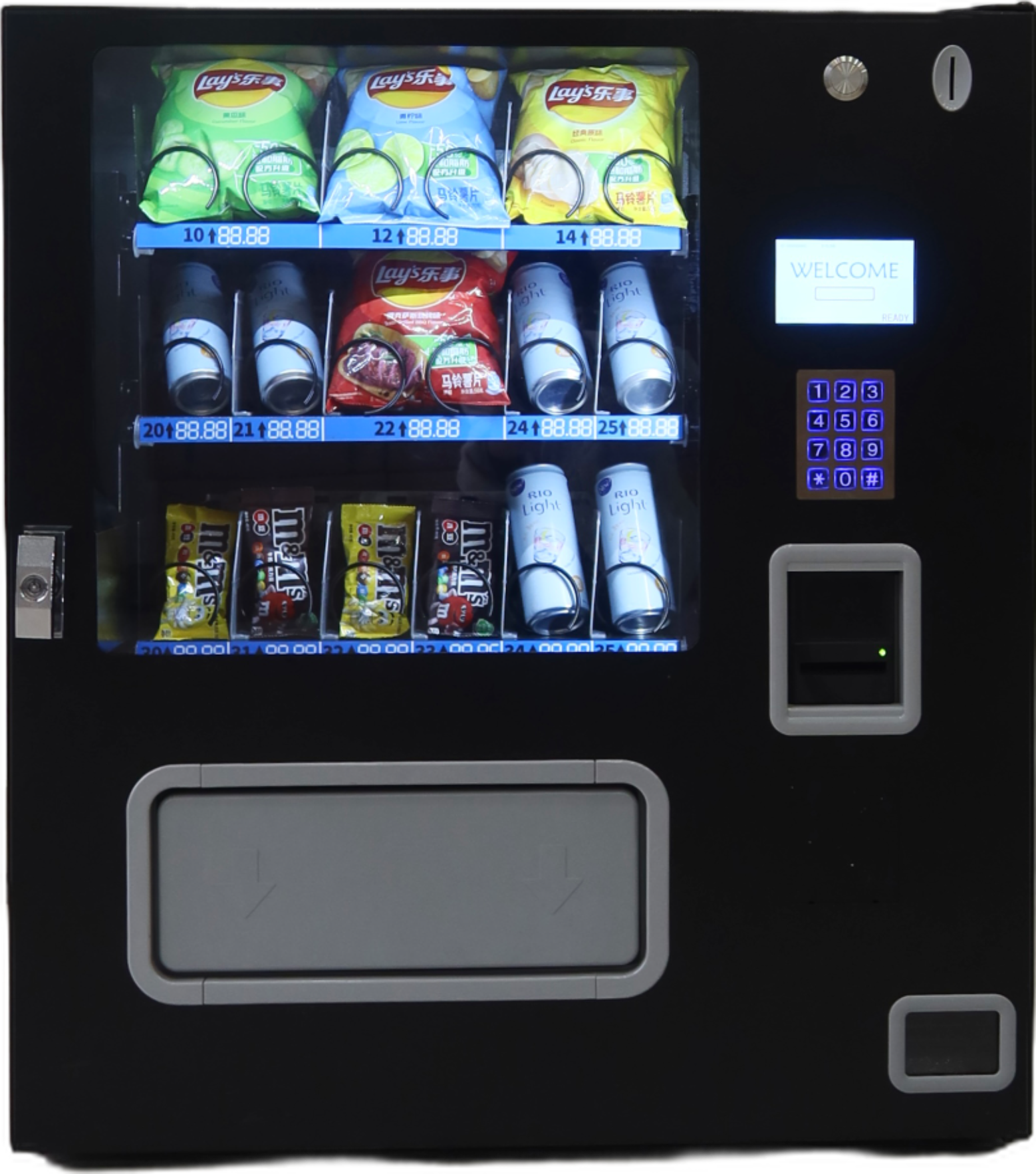 Capacity: 60 Candies, 28 Chips, 30 Drinks 118 Total Items